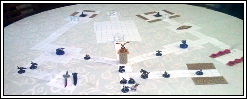 Mordekai como batedor foi na frente e indicou o caminho a direita, onde passavam por uma enorme estatua de Bane no centro da encruzilhada, os companheiros seguiram Mordekai até um pequeno salão de 9x9m com outra estatua menor no centro, mas grande o suficiente para que dois ogros pudessem se esconder atrás delas, Arkaham ouviu a conversa dos ogros falando sobre a troca de guardas, e deduziu que estivessem indo render os que foram mortos pelo grupo, porem não teve tempo de avisar aos demais, os ogros os avistaram e de repente estavam todos dentro de uma pequena sala em volta de uma estatua com suas armas em mãos.